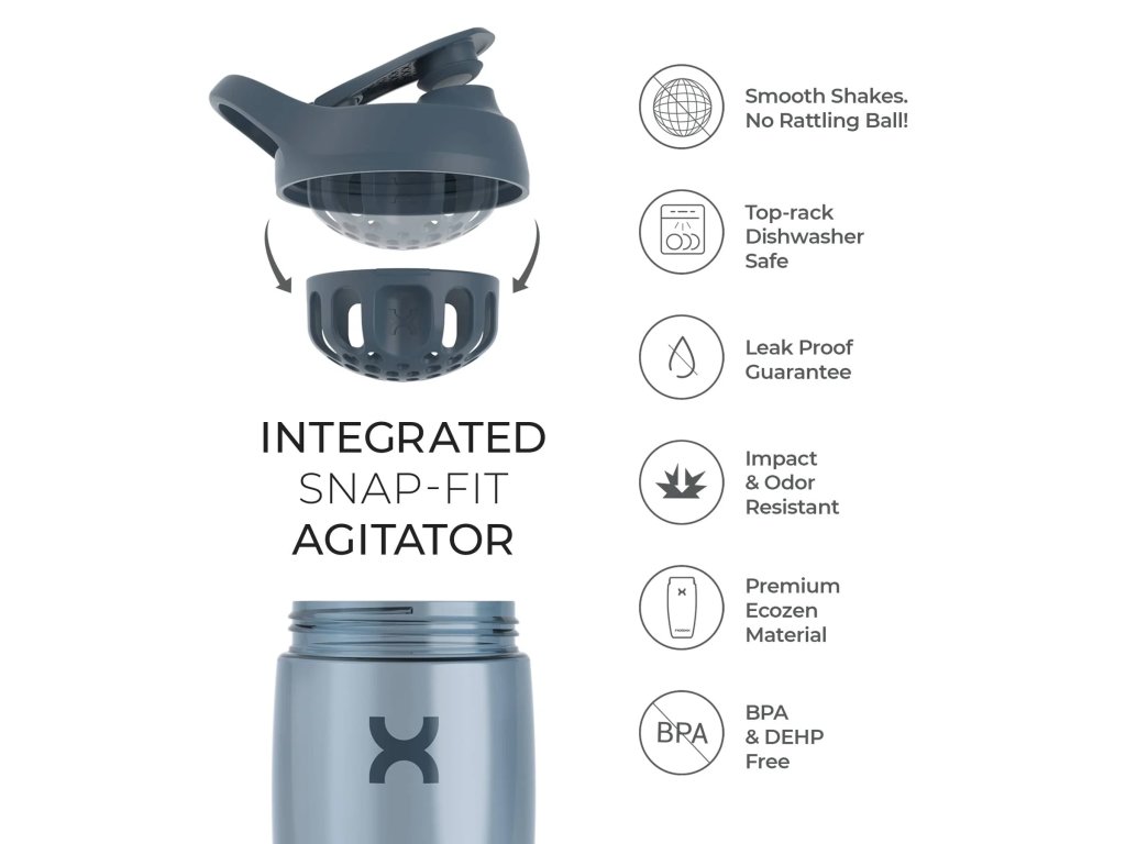 Speciální Snap-fit agitátor se zacvakne přímo do sportovního víčka a zajistí dokonale hladký nápoj – a co je nejdůležitější, žádná otravná kovová kulička, která rachotí!
