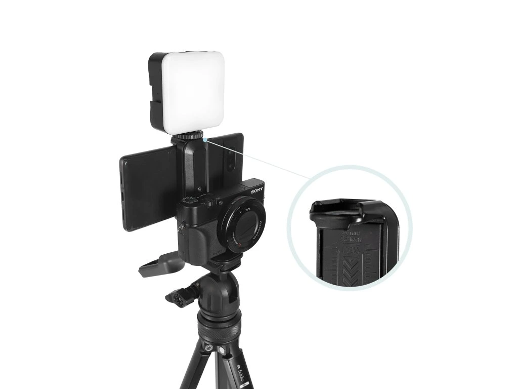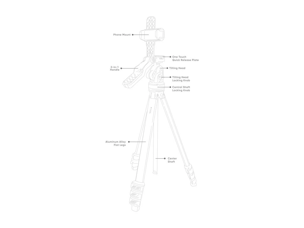 Rukojeť hliníkového stativu TT poskytuje kontrolu proti chvění a rotaci o 360 stupňů pro plynulé záběry. Také slouží jako univerzální držák telefonu, nastavitelný až na 8,4 cm, aby vyhovoval většině chytrých telefonů.